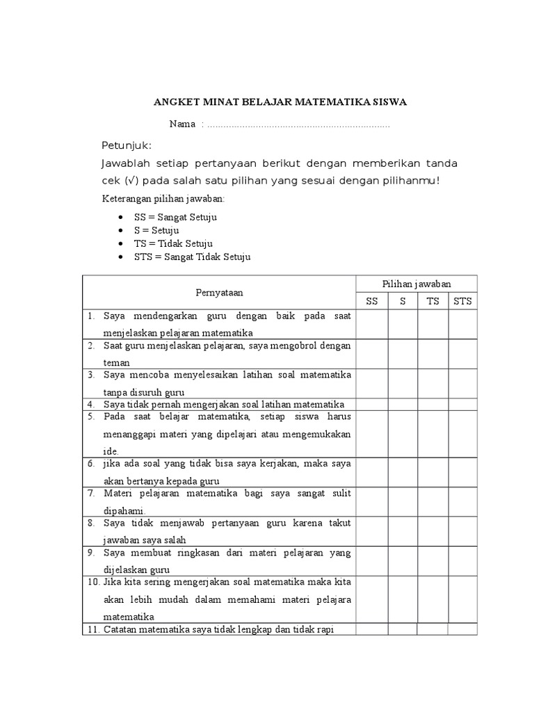 Angket Minat Belajar Matematika Siswa Pdf